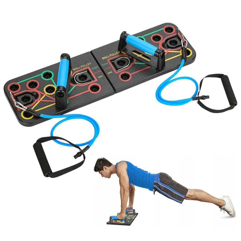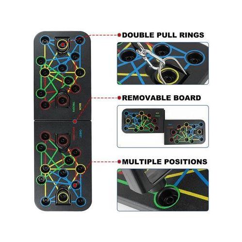 Avec notre planche, vous pouvez entraîner vos muscles de tout votre corps où que vous soyez. Grâce au système de pliage, vous pouvez non seulement vous entraîner à la maison, mais aussi l'emporter partout avec vous, par exemple par exemple en vacances, à l'hôtel, à l'école ou au travail. La planche d'exercice avec poignées est un excellent appareil aussi bien pour les débutants que pour les utilisateurs avancés. Vous permet de travailler les muscles de votre choix en ajustant l'angle et la position des poignées. En utilisant votre propre poids corporel, vous pouvez sculpter les muscles des membres supérieurs et du haut du corps, et grâce aux cordes élastiques incluses dans le kit, vous pouvez également prendre soin de vos fesses et de vos jambes. Notre planche d'exercice multifonctionnelle avec poignées de pompes et cordons élastiques est l'outil parfait pour votre salle de gym à domicile. Avec cet appareil et vos efforts, vous sculpterez votre haut et votre bas du corps.